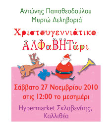 Οι εκδόσεις Παπαδόπουλος και το Hypermarket Σκλαβενίτη στην Καλλιθέα έχουμε ετοιμάσει για σας μια χαρούμενη εκδήλωση για να “μυρίσει” Χριστούγεννα, με κάτι θεότρελλα καλικατζαράκια που θέλουν να …μάθουν γράμματα! Αν είναι δυνατόν!Που: Hypermarket Σκλαβενίτη στην Καλλιθέα ( Πρώην ΙΖΟΛΑ) Ευριπίδου 69 και Αιγεώς 31-35, Καλλιθέα