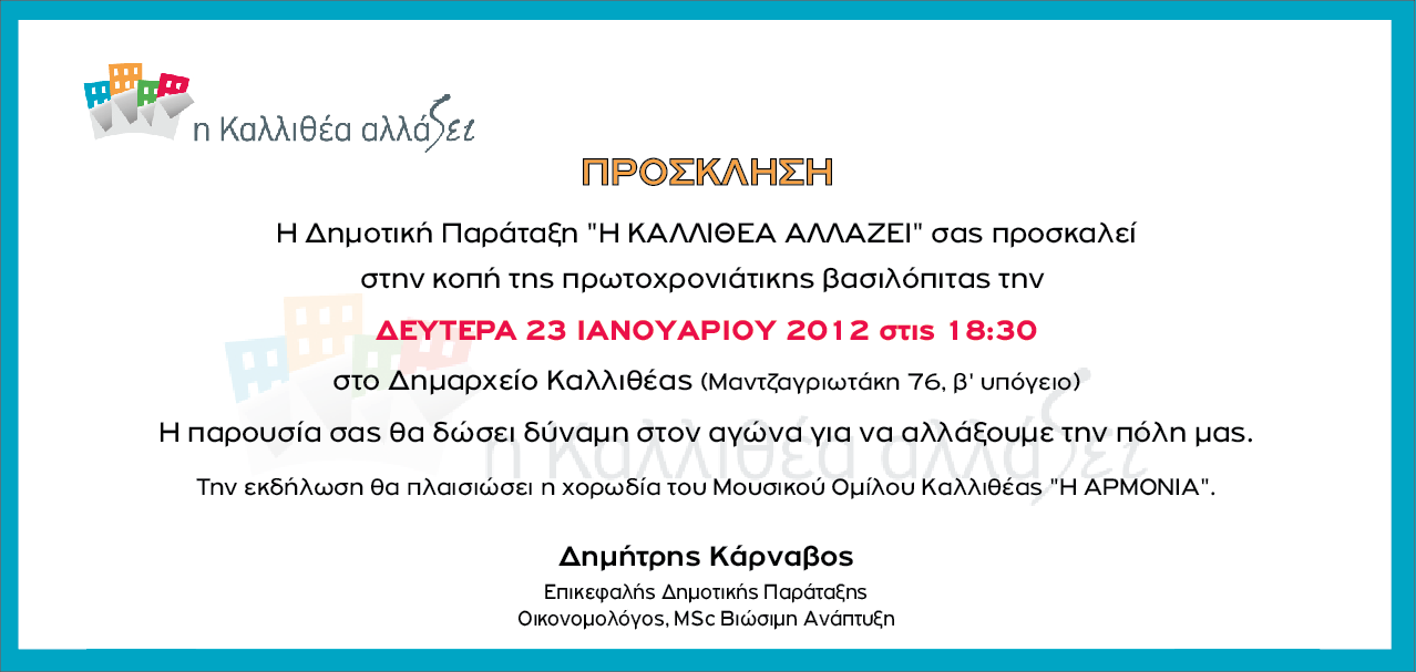 Η Δημοτικη Παράταξη “Η ΚΑΛΛΙΘΕΑ ΑΛΛΑΖΕΙ” σας προσκαλει στην κοπή της πρωτοχρονιάτικης βασιλόπιτας την