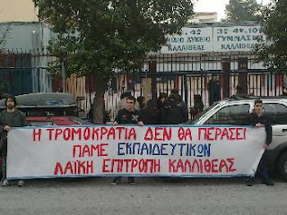 Αποφασισμένοι να σταθούν εμπόδιο σε κάθε προσπάθεια τρομοκράτησης μαθητών που αγωνίζονται, σε κάθε τιμωρία μαθητή, επειδή διεκδικεί τα δικαιώματά του δήλωσαν χτες εκπρόσωποι της Λαϊκής Επιτροπής Καλλιθέας και εκπαιδευτικοί του ΠΑΜΕ, στη συγκέντρωση που έκαναν στο 4ο Λύκειο Αγ. Νικολάου στην Καλλιθέα. Αφορμή ήταν η τιμωρία μαθητή, μέλους του 15μελούς του σχολείου, ο οποίος κατήγγειλε πιέσεις από την πλευρά των εκπαιδευτικών απέναντι στους μαθητές στις πρόσφατες κινητοποιήσεις τους.