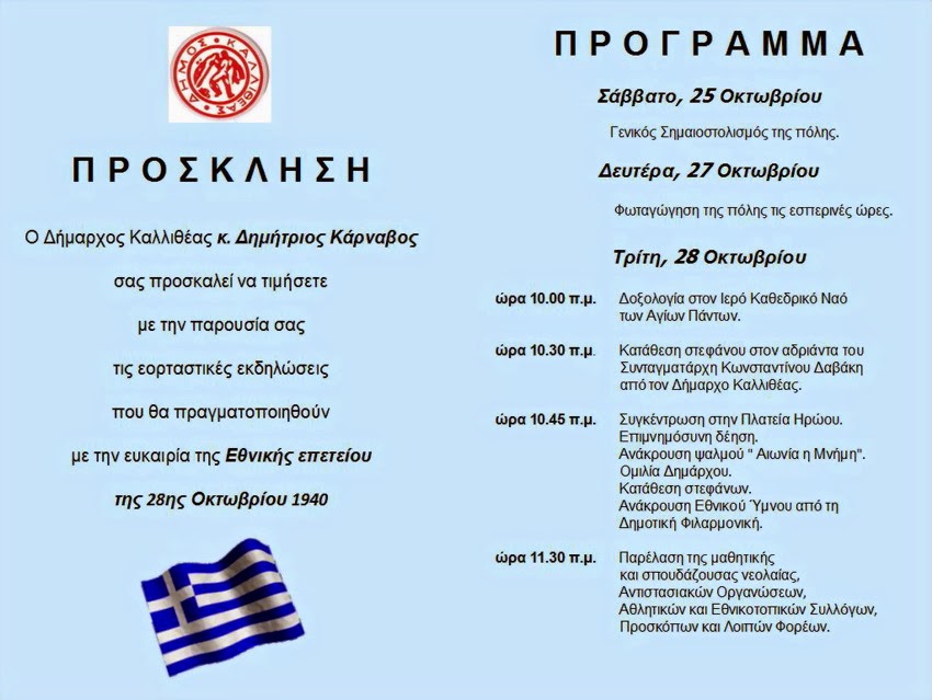 Εορταστικές εκδηλώσεις στην Καλλιθέα για την Εθνική επέτειο της 28ης Οκτωβρίου 1940 27 Οκτωβρίου, 20142 Φεβρουαρίου, 2023 athinapoli