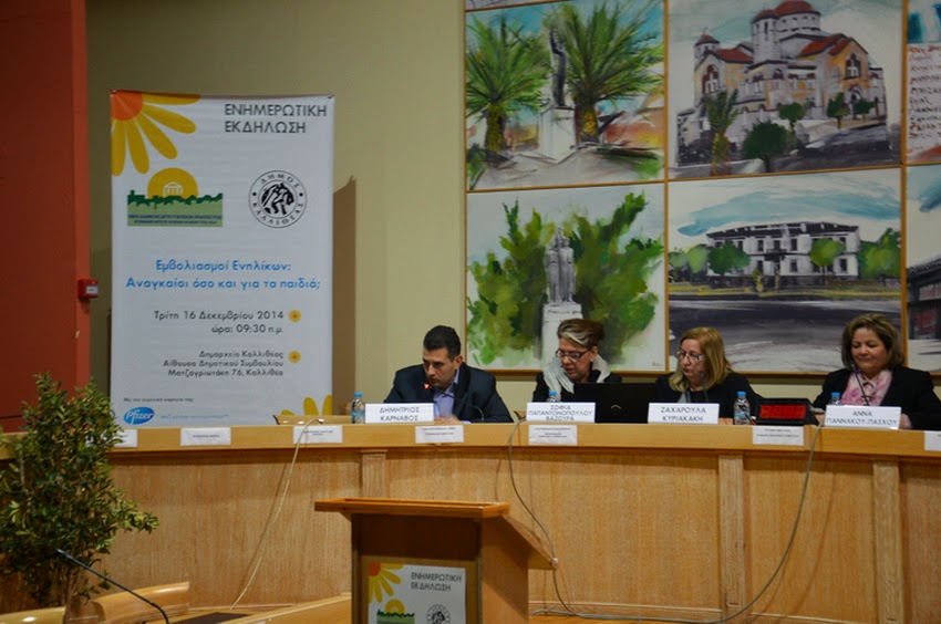 Το Εθνικό Διαδημοτικό Δίκτυο Υγιών Πόλεων – Προαγωγής Υγείας και οΔήμος Καλλιθέας, στα πλαίσια της συνεργασίας τους για την έγκυρη ενημέρωση των πολιτών σε θέματα Υγείας και Πρόληψης, διοργάνωσαν με την υποστήριξη της εταιρείας Pfizer Ελλάς και τη συνεργασία της εξειδικευμένης εταιρείας New Event Generation, Ενημερωτική Εκδήλωση για τους Δημότες, με θέμα: «Εμβολιασμοί Ενηλίκων: Αναγκαίοι όσο και για τα παιδιά;» στο Δημαρχείο Καλλιθέας, την Πέμπτη, 16 Δεκεμβρίου 2014.