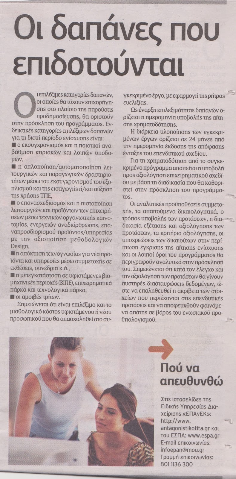 Οικονομική ενίσχυση από 6.000 έως 80.000 ευρώ μπορούν να διεκδικήσουν μικρές επιχειρήσεις που απασχολούν προσωπικό μέχρι 50 άτομα για την ανανέωση του εξοπλισμού τους καθώς και για εισαγωγή τεχνολογιών πληροφορικής και επικοινωνίας. Και αν προχωρήσουν και σε προσλήψεις ανέργων, τότε η επιδότηση που έχουν τη δυνατότητα να πετύχουν θα ανέβει στα 7.500 με 100.000 ευρώ! Δείτε αναλυτικά το παρακάτω δημοσίευμα του ένθετου Έθνος-εργασία.