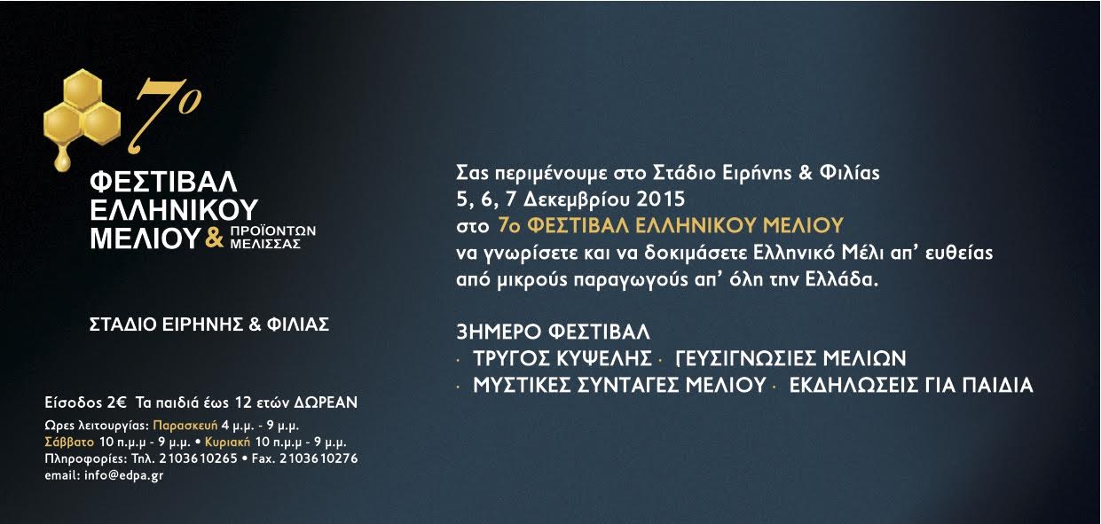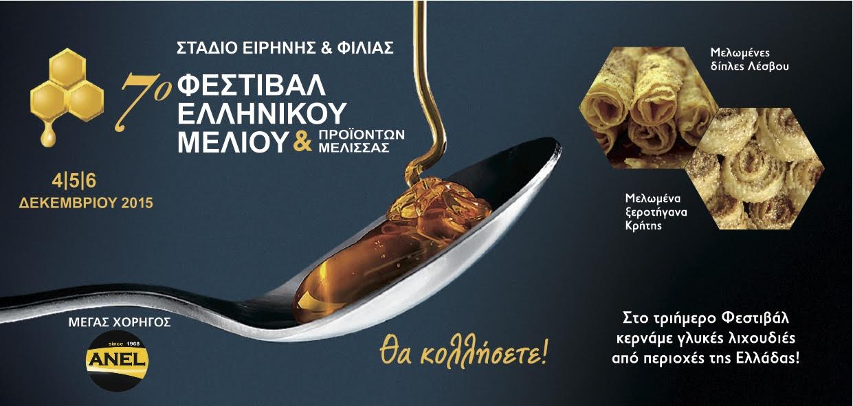 Την Παρασκευή 4 Δεκεμβρίου, το 7ο Φεστιβάλ Ελληνικού Μελιού & Προϊόντων Μέλισσας ανοίγει τις πόρτες του Σταδίου Ειρήνης και Φιλίας και πλημμυρίζει το χώρο με γλύκα και αρώματα! Το μέλι… θα ρέει άφθονο για ακόμα μια χρονιά αφού περισσότεροι από 250 μικροί παραγωγοί θα προσκαλούν το κοινό να γνωρίσει και να απολαύσει το μέλι τους.