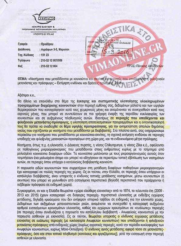 Με έγγραφο φωτιά που αποκαλύπτει το vimaonline.gr, το ΚΕΕΛΠΝΟ προειδοποιεί τις Περιφέρειες και τους Δήμους της χώρας, που έχουν στα διοικητικά τους όρια χώρους φιλοξενίας μεταναστών και προσφύγων, πως αυτοί είναι εν δυνάμει υγειονομικές βόμβες. (Δείτε εδώ ολόκληρη την αναφορά του ΚΕΕΛΠΝΟ)