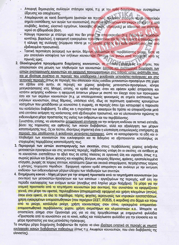 Το ΚΕΕΛΠΝΟ καλεί τους δήμους και τις Περιφέρειες να προβούν άμεσα σε ψεκασμούς για την καταπολέμηση των κουνουπιών και στην δημιουργία αποχετεύσεων, αφού όπως αναφέρει “θεωρείται υπαρκτός ο κίνδυνος εγχώριας μετάδοσης ελονοσίας και άλλων επικίνδυνων ασθενιών σε ευάλωτες περιοχές που υποδέχονται ή φιλοξενούν μετανάστες – πρόσφυγες από ενδημικές χώρες”.