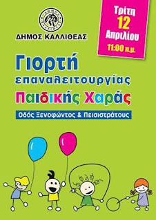 Τα εγκαίνια επαναλειτουργίας μίας ακόμη Παιδικής Χαράς πρόκειται να τελέσει ο Δήμος Καλλιθέας την Τρίτη 12 Απριλίου 2016, στις 11:00, παραδίδοντας στα παιδιά της πόλης έναν τόπο χαράς και παιχνιδιού.