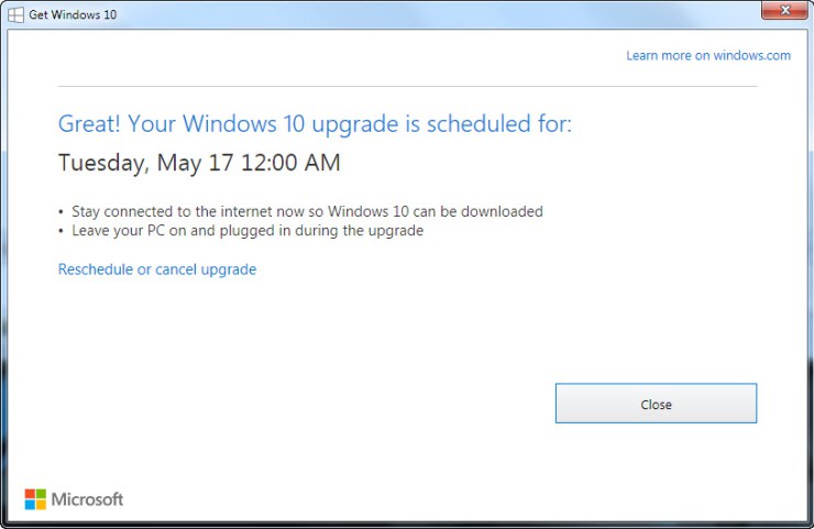 Μην πανικοβληθείτε! Υπάρχει φυσικά η επιλογή να ακυρώσετε ή να αλλάξετε την ημερομηνία αναβάθμισης, πολλοί όμως ίσως να μη δουν καν τη συγκεκριμένη λειτουργία (είναι με ψιλά γράμματα) και να ξυπνήσουν μια ωραία πρωία με Windows 10 στον υπολογιστή τους. Αν δε θέλετε να περάσετε στο νέο λογισμικό της Microsoft, καλό θα ήταν να ελέγχετε τακτικά το pop-up του Windows 10 upgrade. Τουλάχιστον μέχρι τις 29 Ιουλίου, ημερομηνία λήξης της δωρεάν αναβάθμισης.