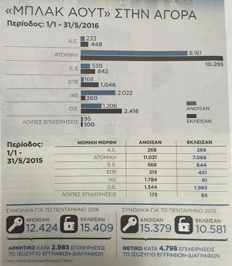Σε επιδημία εξελίσσονται τα διαδοχικά λουκέτα στην αγορά. Μόνο το πρώτο πεντάμηνο του 2016- και σε αντίθεση με ότι συνέβαινε τα προηγούμενα χρόνια- οι επιχειρήσεις που κατέβασαν ρολά σε όλη την χώρα ήταν περισσότερες κατά 2.985 από αυτές που ιδρύθηκαν. Συνολικά μάλιστα στα χρόνια της κρίσης 250.000 επιχειρήσεις ανέστειλαν τη λειτουργία τους οδηγώντας 800.000 εργαζομένους στην ανεργία. Από την αρχή του χρόνου κατέβασαν ρολά 15.409 επιχειρήσεις, όλων των νομικών μορφών (στοιχεία ΓΕΜΗ). Αριθμός ο οποίος είναι αυξημένος κατά 45,87% σε σχέση με το τι συνέβη το αντίστοιχο διάστημα του 2015 όπου αναγκάστηκαν να βάλουν λουκέτο 10.581 εταιρείες. Όταν το αντίστοιχο διάστημα του 2014 διαγράφηκαν από το Γενικό Εμπορικό Μητρώο (ΓΕΜΗ) 14.810 εταιρείες, 15.043 επιχειρήσεις το αντίστοιχο διάστημα του 2013 και 14.403 εταιρείες το πρώτο πεντάμηνο του 2012.