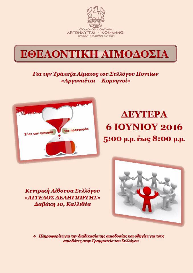 Την Δευτέρα 6 Ιουνίου 2016 και ώρα 17:00-20:00 στην κεντρική Αίθουσα «Άγγελος Δεληγιώργης» του Συλλόγου μας θα πραγματοποιηθεί εθελοντική αιμοδοσία των μελών και φίλων του Συλλόγου μας, για να βοηθήσουμε, όπως κάθε χρόνο, τους συνανθρώπους μας που το χρειάζονται.