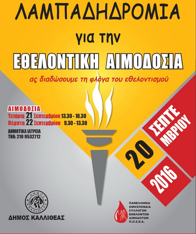 14η Πανελλήνια Λαμπαδηδρομία Εθελοντών Αιμοδοτών 16 Σεπτεμβρίου, 20162 Φεβρουαρίου, 2023 athinapoli Τρίτη 20 Σεπτεμβρίου 2016 και ώρα 20:30 στην Πλατεία Κύπρου & Αιμοδοσία στα Δημοτικά Ιατρεία.
