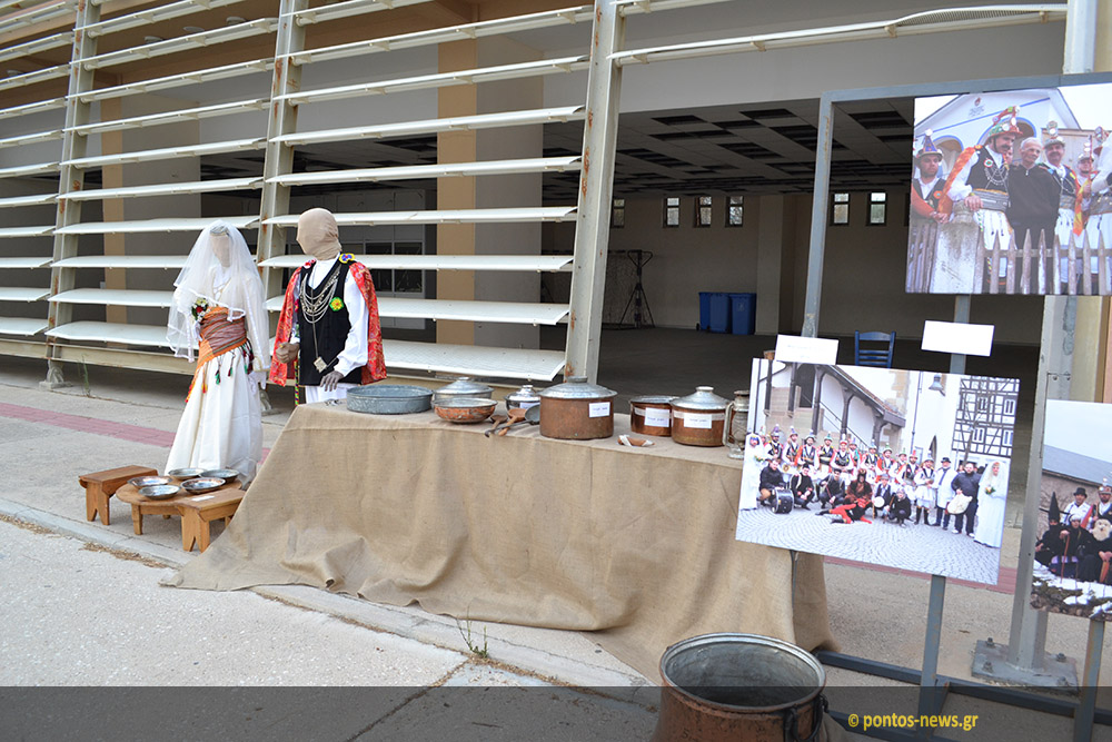 Αμέσως μετά την είσοδο στο χώρο των εκδηλώσεων, η εικόνα του ποντιακού χωριού: οικιακά σκεύη από τον Πόντο, αυθεντικές φορεσιές, έκθεση φωτογραφιών, βιβλίων αλλά και παραδοσιακών μουσικών οργάνων υποδέχονταν τους επισκέπτες.