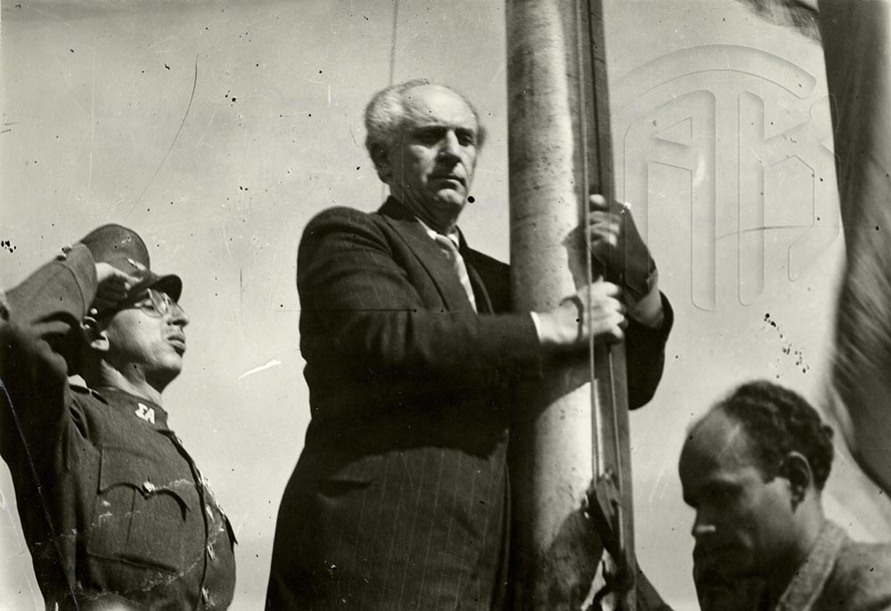 | 18 Οκτωβρίου 1944. Ο πρωθυπουργός Γεώργιος Παπανδρέου, κατά την πρώτη ελεύθερη έπαρση της ελληνικής σημαίας στην Ακρόπολη. Γενικά Αρχεία του Κράτους – Κεντρική Υπηρεσία – Βασίλης Τσακιράκης