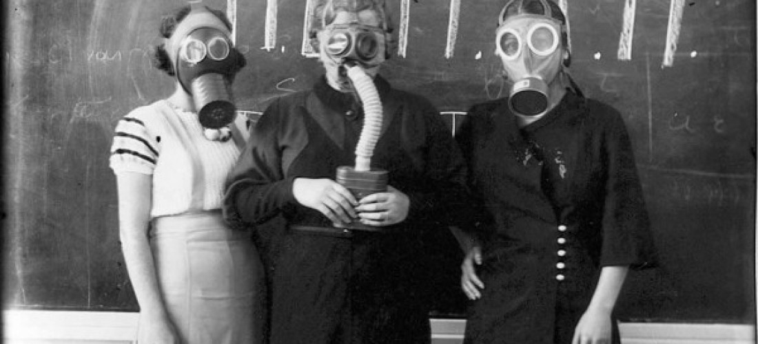 | Προετοιμάζοντας τον πληθυσμό για τον πόλεμο. Δασκάλες εκπαιδεύονται στην χρήση αντιασφυξιογόνων μασκών σε σχολική αίθουσα, Αρχείο ΕΡΤ – Πέτρος Πουλίδης |