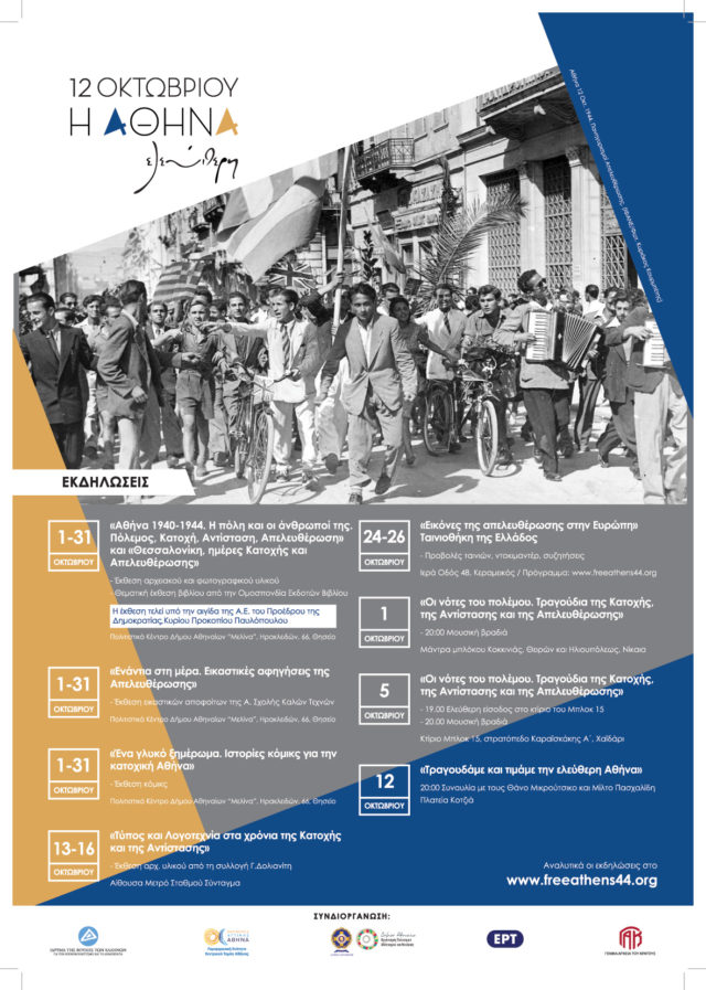 Στο πλαίσιο των δράσεων για τον εορτασμό της απελευθέρωσης της Αθήνας από τη ναζιστική κατοχή, υπό το γενικό τίτλο «12 Οκτωβρίου 1944. Η Αθήνα ελεύθερη», διοργανώνονται φέτος οι εκθέσεις «Αθήνα 1940-1944. Η πόλη και οι άνθρωποί της. Πόλεµος, Κατοχή, Αντίσταση, Απελευθέρωση» και«Θεσσαλονίκη, ηµέρες Κατοχής και Απελευθέρωσης».