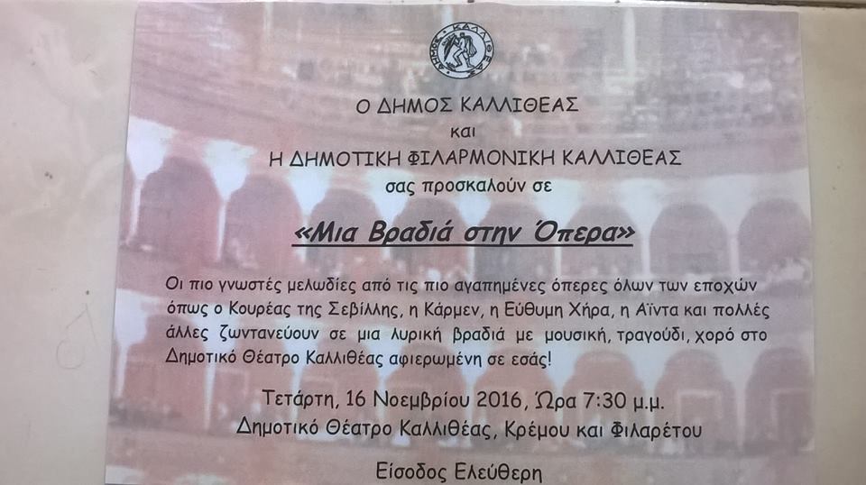 Την Τετάρτη , 16 Νοεμβρίου 2016, στις 7. 30 μ.μ., σας περιμένουμε στο Δημοτικό Θέατρο Καλλιθέας (Κρέμου και Φιλαρέτου, Καλλιθέα) για μια ξεχωριστή βραδιά! Μαζί μας τραγουδούν η Βασιλεία Καλλίτση (σοπράνο), ο Γιάννης Μπρίτσας (τενόρος) κι ο Μαρίνος Ταρνανάς (βαρύτονος)! Χορεύουν η Μαρία Γρηγοροπούλου, η Δήμητρα Δαγδανέλη κι η Δήμητρα Κοντογιάννη, απο τη Σχολή Χορού Dance Art Voula, την πρώτη στη Βούλα από το 1984, η οποία βρίσκεται στην Λ. Βουλιαγμένης 12,υπό τη διεύθυνση της κ.Κ. Κυριακού-Χατζημανώλη και σε συνεργασία με το London Royal Academy of Dance δίνει πιστοποιημένα πτυχία! Συμμετέχουν οι ηθοποιοί Κώστας Φουστέρης και Γιώργος Παπακωστόπουλος, από το Θεατρικό Εργαστήρι του Δήμου Καλλιθέας, υπό τη διεύθυνση του κ. Γ. Γαλάντη! Φοράμε τα “καλά” μας κι ετοιμαζόμαστε να σας υποδεχθούμε!