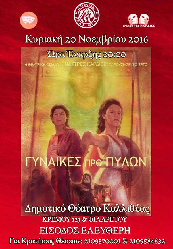 Την Κυριακή 20 Νοεμβρίου 2016, η θεατρική ομάδα “Έναστρες Καρδιές” δίνει την τελευταία παράσταση στο δημοτικό θέατρο Καλλιθέας με το έργο “Γυναίκες προ Πυλών”.