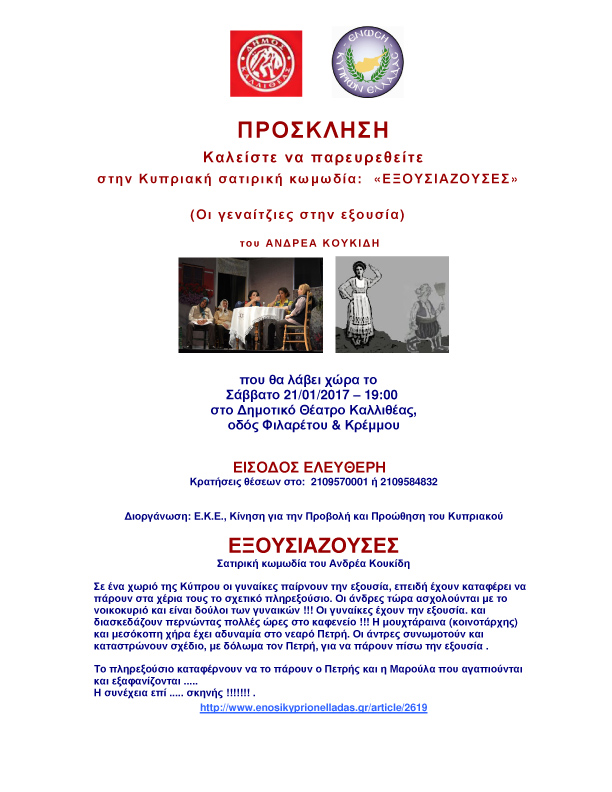 «ΕΞΟΥΣΙΑΖΟΥΣΕΣ» 19 Ιανουαρίου, 20172 Φεβρουαρίου, 2023 athinapoli ΣΑΤΙΡΙΚΗ ΚΩΜΩΔΙΑ ΤΟΥ ΑΝΔΡΕΑ ΚΟΥΚΙΔΗ ΑΠΟ ΤΗΝ ΕΝΩΣΗ ΚΥΠΡΙΩΝ ΕΛΛΑΔΑΣ ΣΑΒΒΑΤΟ 21 ΙΑΝΟΥΑΡΙΟΥ 2017 ΣΤΙΣ 19:00 ΕΙΣΟΔΟΣ ΕΛΕΥΘΕΡΗ – Κρατήσεις θέσεων: 210 9570001 & 210 9584832