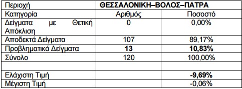 Στα υπόλοιπα 107 πρατήρια (89,17%) οι αποκλίσεις ήταν αποδεκτές, δηλ. εντός