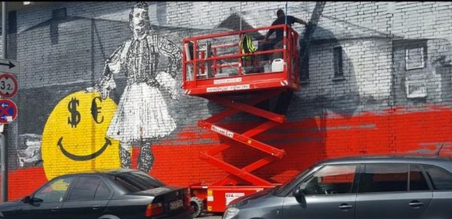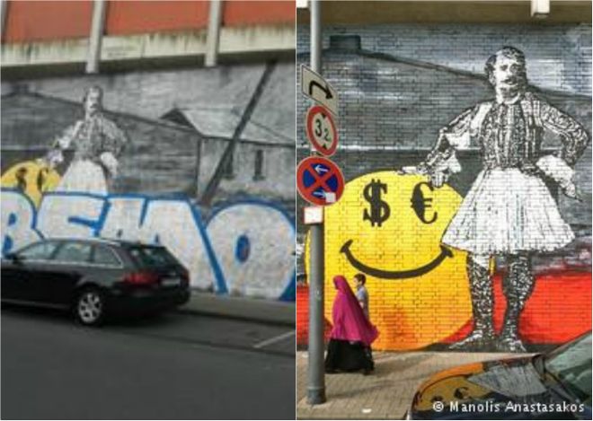 Ο Μανώλης Αναστασάκος είναι όντως ένας πολύπλευρος καλλιτέχνης. Ο ίδιος συστήνεται ως καλλιτεχνικός διευθυντής “Βιομιμητισμού Ελλάδος Έρευνας και Καινοτομίας”. Ένα καλλιτεχνικό κίνημα που εμπνέεται και διδάσκεται από τη φύση. Ο Μανώλης σπούδασε στη Σχολή Καλών Τεχνών της Θεσσαλονίκης. Έχει ασχοληθεί με την εικαστική ψυχοθεραπεία και έχει κάνει ανάμεσα στα άλλα σκηνοθεσία με τον Εμίρ Κουστουρίτσα στη Σερβία. Στην Κολωνία φιλοτέχνησε έναν  φουστανελά.  Στο βάθος της εικόνας διακρίνεται μια άποψη του Πειραιά όπως αυτός ήταν πριν από αρκετές δεκαετίες. Ο τσολιάς ακουμπάει σε ένα τεράστιο κίτρινο smiley που στο ένα μάτι έχει το δολάριο και στο άλλο το ευρώ. «Είμαστε άραγε περήφανοι για αυτή τη διαδικασία, το ότι έχουμε αγκαλιάσει ένα χρηματοπιστωτικό σύστημα το οποίο είναι πληθωρισματικό και μας κουράζει και μας ταλαιπωρεί αλλά κανείς δεν μιλάει για αυτό; Είμαστε άραγε υπερήφανοι που στέκουμε αδύναμοι κόντρα στους αριθμούς και στο οικονομικό καθεστώς; Αυτά είναι τα δικά μου κομμάτια. Τώρα το τι καταλαβαίνει ο κάθε θεατής είναι στη δική του κρίση και σε τελική ανάλυση το έργο εκφράζει την κριτική του εκάστοτε θεατή» λέει ο Μανώλης Αναστασάκος.