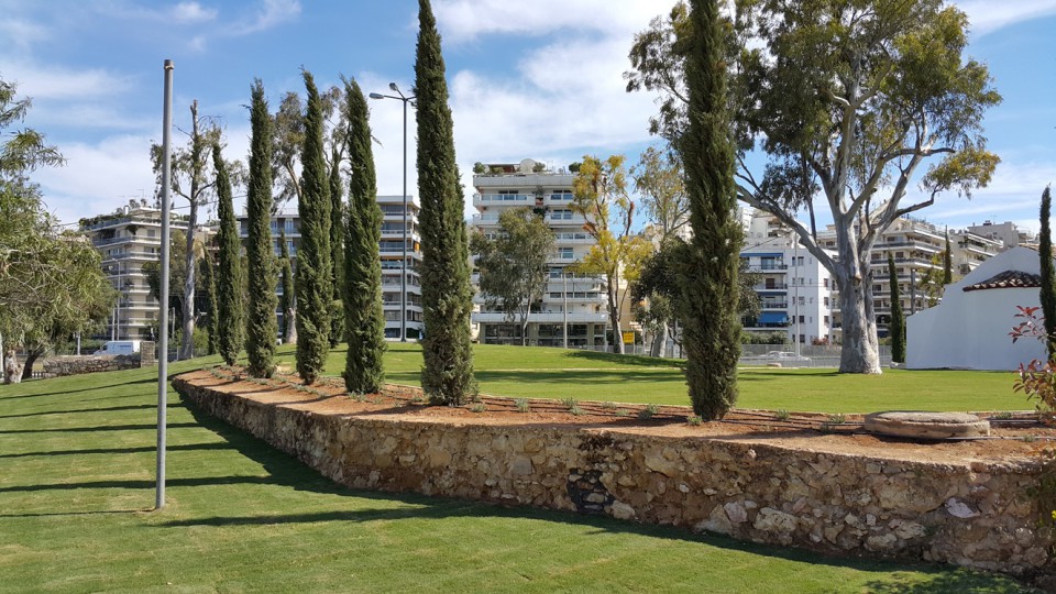Παράλληλα, διατηρούνται τα υφιστάμενα επίπεδα του φυσικού εδάφους με κάποιες περιορισμένες τοπογραφικές τροποποιήσεις ενώ ο χώρος διατηρεί την φυσιογνωμία του με ήπιες παρεμβάσεις εμπλουτισμού της υφιστάμενης βλάστησης. Επίσης, σημαντικό μέρος της παρέμβασης περιλαμβάνει επένδυση με χλοοτάπητα, γραμμικές φυτεύσεις δένδρων και δημιουργία λωρίδων πρασίνου με πρόβλεψη για εγκατάσταση αυτόματου συστήματος άρδευσης.
