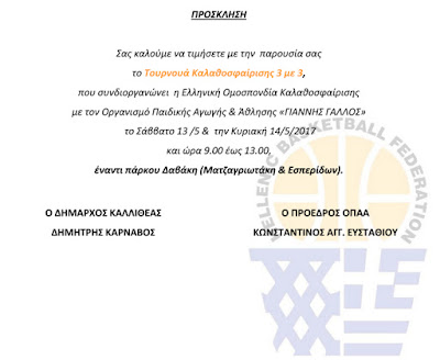 Μην χάσετε το Τουρνουά Καλαθοσφαίρισης 3 με 3 που συνδιοργανώνει η Ελληνική Ομοσπονδία Καλαθοσφαίρισης με τον Οργανισμό Παιδικής Αγωγής & Άθλησης “Γιάννης Γάλλος” το Σάββατο 13 και την Κυριακή 14 Μαΐου