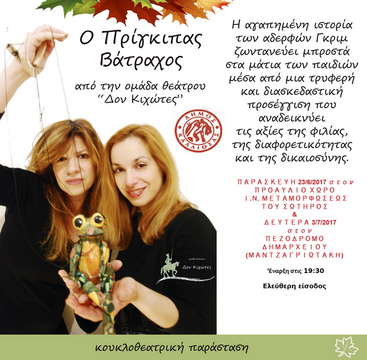 «Ο ΠΡΙΓΚΙΠΑΣ ΒΑΤΡΑΧΟΣ» 28 Ιουνίου, 20172 Φεβρουαρίου, 2023 athinapoli Κουκλοθέατρο από την ομάδα «Δον Κιχώτες» ΔΕΥΤΕΡΑ 3 ΙΟΥΛΙΟΥ 2017 στις 19:30 ΕΛΕΥΘΕΡΗ ΕΙΣΟΔΟΣ