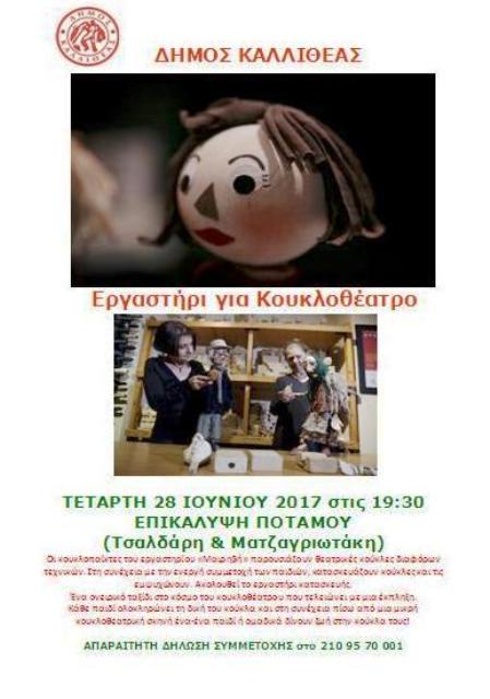 «Εργαστήρι για Κουκλοθέατρο» 25 Ιουνίου, 20172 Φεβρουαρίου, 2023 athinapoli Εργαστήρι κατασκευής κούκλας και κουκλοθεατρική σκηνή ΤΕΤΑΡΤΗ 28 ΙΟΥΝΙΟΥ 2017 στις 19:30 ΕΛΕΥΘΕΡΗ ΕΙΣΟΔΟΣ – ΑΠΑΡΑΙΤΗΤΗ ΔΗΛΩΣΗ ΣΥΜΜΕΤΟΧΗΣ στο 210 95 70 001