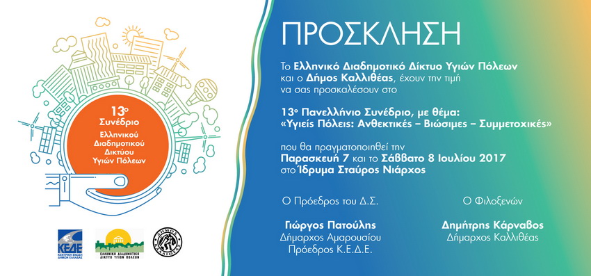 Το 13ο Συνέδριο του Ελληνικού Διαδημοτικού Δικτύου Υγιών Πόλεων θα πραγματοποιηθεί στο Ίδρυμα Σταύρος Νιάρχος, στην Καλλιθέα στις 7-8 Ιουλίου 2017.