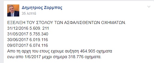 Σύμφωνα με σημερινή ανάρτηση του κ Δ. Ζορμπά, επικεφαλής της Επιτροπής Αυτοκινητου της Ενωσης Ασφαλιστικών Εταιριών και CEO της Συνεταιριστικής Ασφαλιστικής , στο FB, ο στόλος των ασφαλισμένων αυτοκινήτων αυξήθηκε κατά 464.905 από την αρχή του χρόνου ενώ από την 1/6/2017 μέχρι και σήμερα υπήρξε αύξηση που έφθασε τα 318.776.