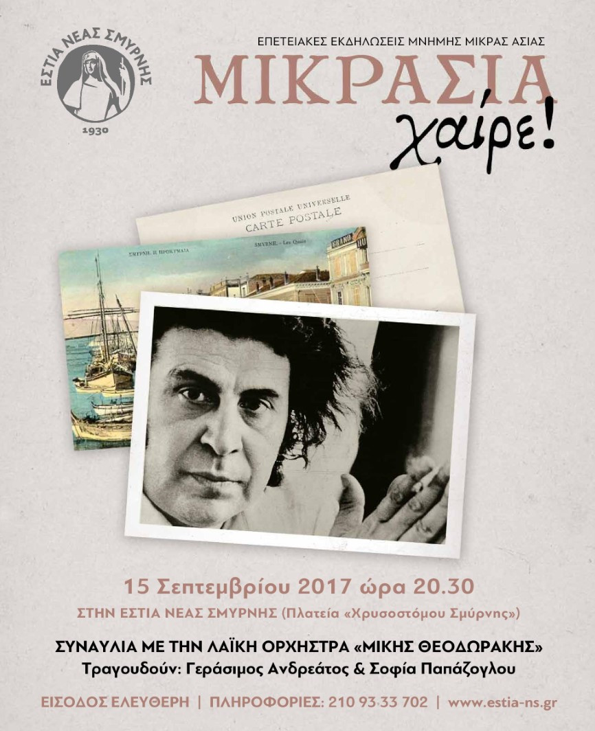 Η ΕΣΤΙΑ Νέας Σμύρνης, με αφορμή την συμπλήρωση 95 χρόνων από την καταστροφή της Σμύρνης τιμά τον σπουδαίο Έλληνα συνθέτη Μίκη Θεοδωράκη.
