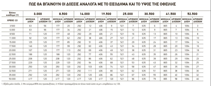Στον αποκαλυπτικό πίνακα που δημοσιεύει ο «Ε.Τ.» της Κυριακής φαίνεται ότι ανάλογα με το δηλωθέν εισόδημα και το ύψος της οφειλής η ρύθμιση βγαίνει σε 120 δόσεις, σε 96 δόσεις, σε 70 δόσεις, σε 60, σε 48, σε 25, σε 10, ακόμη και σε 5 ή 3 δόσεις.