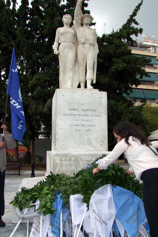 “Οι ανθελληνικές υστερίες των κάθε λογής μπολσεβίκων (γαλάζιων, ροζ, ερυθρών, κλπ) δεν πρόκειται να σταθούν ποτέ αρκετές να αμαυρώσουν τον Εθνικιστικό χαρακτήρα της επετείου της 28ης Οκτωβρίου. Οι Χρυσαυγίτες και οι Χρυσαυγίτισσες της Καλλιθέας, που αποτελούν και τους μόνους φορείς της ιδεολογικής κληρονομιάς του πατέρα του “ΟΧΙ” Εθνικού Ηγέτη Ιωάννου Μεταξά, τίμησαν και πάντα θα τιμούν το Αίμα των γενναίων προγόνων μας. Στην Καλλιθέα γράψαμε και θα συνεχίσουμε να γράφουμε την ιστορία της μόνης σύγχρονης εθνικής αντίστασης, μέσα από τις τάξεις της Χρυσής Αυγής, τις οποίες σας καλούμε να πυκνώσετε.”