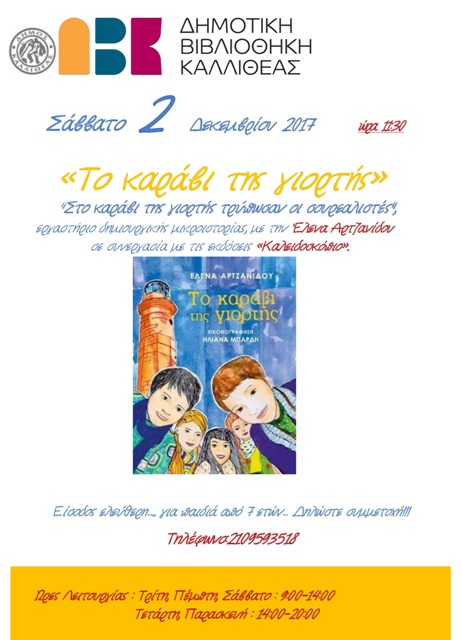 «ΤΟ ΚΑΡΑΒΙ ΤΗΣ ΓΙΟΡΤΗΣ» 29 Νοεμβρίου, 20172 Φεβρουαρίου, 2023 athinapoli Εργαστήριο δημιουργικής μικροϊστορίας για παιδιά από 7 ετών ΣΑΒΒΑΤΟ 2 ΔΕΚΕΜΒΡΙΟΥ 2017 στις 11:30 Είσοδος ελεύθερη – Δηλώστε συμμετοχή στο 210 9593518 ΔΗΜΟΤΙΚΗ ΒΙΒΛΙΟΘΗΚΗ ΚΑΛΛΙΘΕΑΣ (Ανδρομάχης 86Α & Αλκμήνης)