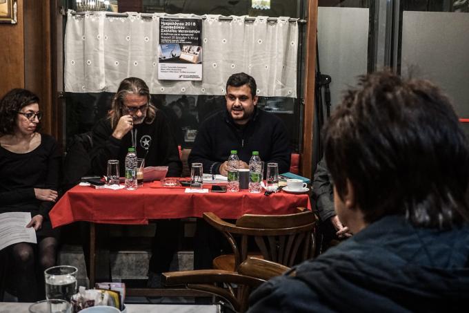 Πάνω από 35 κάτοικοι της Καλλιθέας και των Νοτίων Προαστίων, αγωνιστές και αγωνίστριες του αντιρατσιστικού κινήματος (και όχι μόνο), μαζεύτηκαν στο Καφενείο «1968″ και παρακολούθησαν μια έντονη σε προβληματισμούς και εικόνες συζήτηση σχετικά με το ημερόλογιο αλλά και την κατάσταση στο προσφυγικό. Τη συζήτηση άνοιξε η Ερνεστίνα Καρυστιναίου (Κίνηση «Απελάστε το Ρατσισμό» Νοτίων), που τόνισε τη σημασία του ημερολόγιου του Κυριακάτικου Σχολείου Μεταναστών ως ένα από τα δύο βασικά έσοδα του σχολείου για τη χρονιά που ακολουθεί. Ανέφερε ενδεικτικά το φωτογραφικό υλικό και τα σκίτσα που κοσμούν το ημερολόγιο, και παρουσίασε τις δράσεις και τη λειτουργία του Κυριακάτικου Σχολείου Μεταναστών. Ο Δημήτρης Γεωργοπάλης (σκιτσογράφος) μίλησε για τις ευθύνες τις κυβέρνησης και του συστήματος για τον αποκλεισμό και τις απαράδεκτες συνθήκες διαβίωσης των μεταναστών/τριών και των προσφύγων στην Ελλάδα. Τόνισε την υποκρισία της ΕΕ που λογόκρινε αντιφασιστικά σκίτσα (ανάμεσά τους και ένα δικό του) ως σκίτσα που προμοτάρουν το φασισμό και ενημέρωσε για την πολιτική δράση και το δημόσιο στίγμα που προσπαθεί να έχει η Ένωση Ελλήνων Γελοιογράφων με δράσεις όπως η ετήσια Ο Μάριος Λώλος (φωτογράφος) ανέφερε εμπειρίες από το παρελθόν του αντιρατσιστικού κινήματος, αλλά και την εμπειρία του ως φωτογράφος στην Ειδομένη και στα hot spot στο Αιγαίο. Μίλησε για τις δυσκολίες που αντιμετωπίζουν πλέον οι φωτογράφοι -στους οποίους απαγορεύεται η είσοδος στα στρατόπεδα προσφύγων- και για τον κυνισμό και την πολιτική κυβέρνησης και του Μουζάλα που έχει οδηγήσει στην επικράτηση απάνθρωπων συνθηκών, ιδιαίτερα στα νησιά. Τόνισε τον ρόλο των media που σπέρνουν ψευδείς ειδήσεις και ρατσιστικό δηλητήριο σε σχέση με τους πρόσφυγες και μετανάστες, και το καθήκον των φωτορεπόρτερ να αποκαλύπτουν την αλήθεια μέσω των φωτογραφιών τους. Τελειώνοντας, μίλησε για τη σημασία της δράσης των σωματείων και τη σημασία της ενότητας σε αντιπαράθεση με την πολυδιάσπαση των σωματείων σε κάθε κλάδο, ως ισχυρό όπλο που μπορεί να απαντήσει αποτελεσματικά σε μνημόνια και ρατσισμό. Ο Παναγιώτης Λίλλης (Κίνηση «Απελάστε το Ρατσισμό») περιέγραψε το διεθνές πλαίσιο: την ισλαμοφοβία και το ρατσισμό ως εργαλεία διαχωρισμού των «από κάτω» που καλλιεργούνται από τις κυβερνήσεις της Ευρωπαϊκής Ένωσης και τα ΜΜΕ. Σε αυτό το πλαίσιο, η κυβέρνηση ΣΥΡΙΖΑ – ΑΝΕΛ ασκεί ρατσιστική πολιτική, που αποτελεί νερό στο μύλο των φασιστών της Χρυσής Αυγής και λοιπών ακροδεξιών οργανώσεων. Μόνη απάντηση είπε ο Παναγιώτης Λίλλης, είναι ο κοινός αγώνας ντόπιων και μεταναστών, ο ενιαίος αγώνας ενάντια σε μνημόνια και ρατσισμό, γιατί ο αντιρατσισμός δεν μπορεί να είναι αποτελεσματικός αν δεν απευθύνεται στις αιτίες που δημιουργούν τη φτώχεια. Μετά τις εισηγήσεις των ομιλητών, τέθηκαν πλούσιοι προβληματισμοί, ιδέες και όρεξη για δράση από τον κόσμο που παρακολουθούσε την εκδήλωση. Από την πλειοψηφία των τοποθετήσεων φάνηκε η ανάγκη συνέχισης της συζήτησης, ως απάντηση στην κυρίαρχη ρατσιστική προπαγάνδα των ΜΜΕ αλλά και η οργάνωση τοπικών δράσεων στην Καλλιθέα και τις γύρω περιοχές.