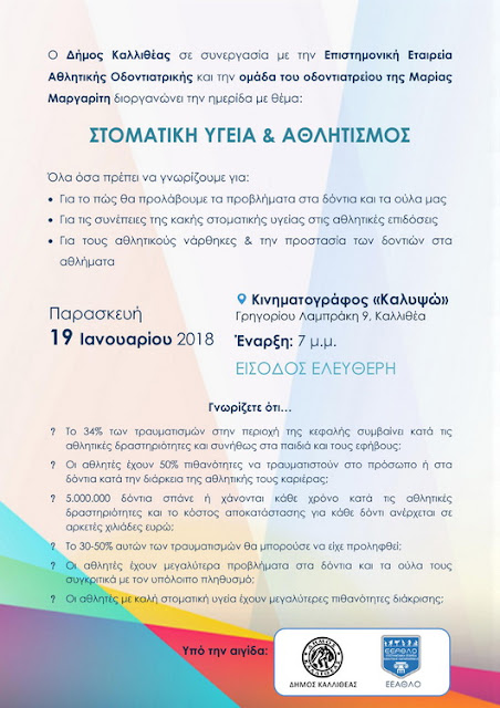 Ο Δήμος Καλλιθέας σε συνεργασία με την Επιστημονική Εταιρεία Αθλητικής Οδοντιατρικής και την ομάδα του οδοντιατρείου της Μαρίας Μαργαρίτη διοργανώνει την ημερίδα με θέμα: