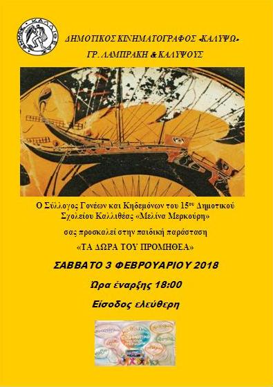 «ΤΑ ΔΩΡΑ ΤΟΥ ΠΡΟΜΗΘΕΑ» 30 Ιανουαρίου, 20182 Φεβρουαρίου, 2023 athinapoli Παιδική παράσταση από το 15ο Δημοτικό Σχολείο ΣΑΒΒΑΤΟ 3 ΦΕΒΡΟΥΑΡΙΟΥ 2018 στις 18:00 ΕΙΣΟΔΟΣ ΕΛΕΥΘΕΡΗ ΔΗΜΟΤΙΚΟΣ ΚΙΝΗΜΑΤΟΓΡΑΦΟΣ «ΚΑΛΥΨΩ» (Γρ. Λαμπράκη 9 & Καλυψούς)
