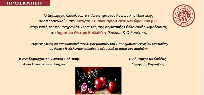 στην κοπή της πρωτοχρονιάτικης πίτας, της Δημοτικής Εθελοντικής Αιμοδοσίας στο Δημοτικό Θέατρο Καλλιθέας (Κρέμου & Φιλαρέτου).