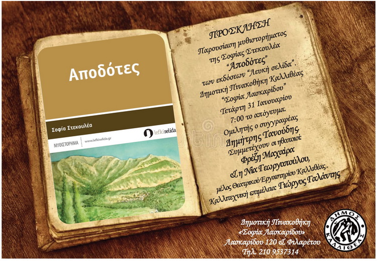 «ΑΠΟΔΟΤΕΣ» 30 Ιανουαρίου, 20182 Φεβρουαρίου, 2023 athinapoli Παρουσίαση μυθιστορήματος της Σοφίας Στεκουλέα ΤΕΤΑΡΤΗ 31 ΙΑΝΟΥΑΡΙΟΥ 2018 στις 19:00 ΕΙΣΟΔΟΣ ΕΛΕΥΘΕΡΗ ΔΗΜΟΤΙΚΗ ΠΙΝΑΚΟΘΗΚΗ ΚΑΛΛΙΘΕΑΣ «ΣΟΦΙΑ ΛΑΣΚΑΡΙΔΟΥ» (Λασκαρίδου 120)