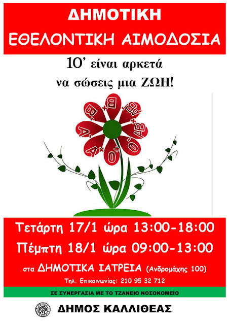 Η αιμοδοσία θα πραγματοποιηθεί σε συνεργασία με το Γενικό Νοσοκομείο «ΤΖΑΝΕΙΟ»