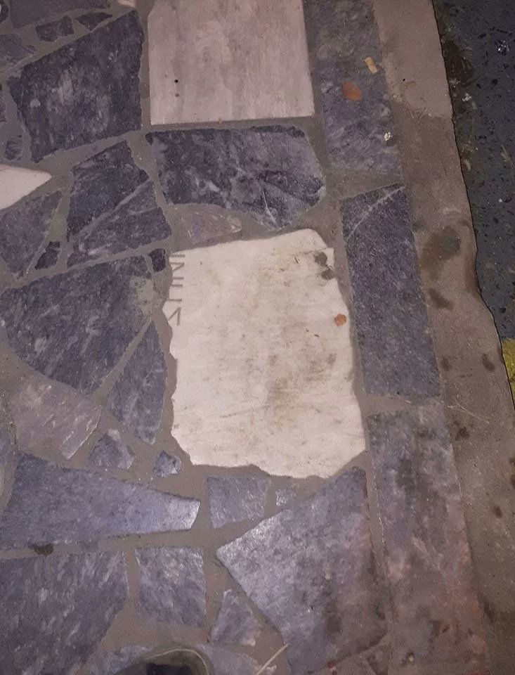 Όπως μπορείτε να δείτε και στην φωτογραφία που έχει γίνει viral στο Twitter κάποιες από τις πλάκες που χρησιμοποιήθηκαν, προφανώς είχαν χρησιμοποιηθεί από νεκροταφείο και σε μία από αυτές υπήρχε μέρος από το όνομα ενός ανθρώπου που είχε φύγει από την ζωή.