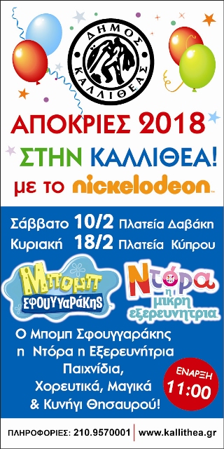 Ώρα : 11.00-13.00 – Εκδήλωση του Nickelodeon με τον Μπομπ Σφουγγαράκη και την Ντόρα την Μικρή εξερευνήτρια. Οι αγαπημένοι ήρωες των παιδιών, με τη βοήθεια του παρουσιαστή, καλωσορίζουν το κοινό, παίζουν μουσικές καρέκλες, στήνουν διαδραστικό χορευτικό με τα παιδιά, καλούν το μάγο να τρελάνει με τα κόλπα του μικρούς και μεγάλους και η διασκέδαση ολοκληρώνεται με το Κυνήγι του Χαμένου Θησαυρού.