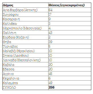 Η κατανομή των θέσεων ανά δήμο έχει ως εξής: