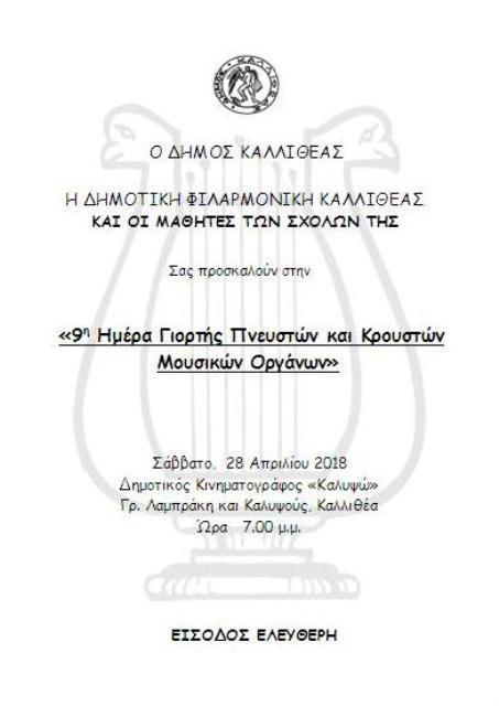 «9η ΗΜΕΡΑ ΓΙΟΡΤΗΣ ΠΝΕΥΣΤΩΝ ΚΑΙ ΚΡΟΥΣΤΩΝ ΜΟΥΣΙΚΩΝ ΟΡΓΑΝΩΝ» 20 Απριλίου, 20182 Φεβρουαρίου, 2023 athinapoli Από τη Δημοτική Φιλαρμονική και τους μαθητές των Σχολών της ΣΑΒΒΑΤΟ 28 ΑΠΡΙΛΙΟΥ 2018 στις 19:00 ΕΙΣΟΔΟΣ ΕΛΕΥΘΕΡΗ