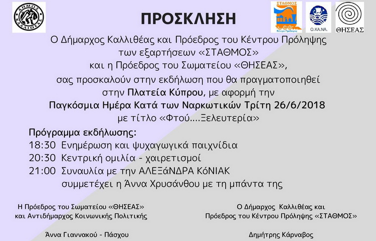 Ο Δήμαρχος Καλλιθέας & Πρόεδρος του Κέντρου Πρόληψης «ΣΤΑΘΜΟΣ» και η Πρόεδρος του Σωματείου «ΘΗΣΕΑΣ», σας προσκαλούν στην εκδήλωση που θα πραγματοποιηθεί στην Πλατεία Κύπρου, με αφορμή την Παγκόσμια Ημέρα Κατά των Ναρκωτικών Τρίτη 26/6/2018 με τίτλο «Φτού….Ξελευτερία».