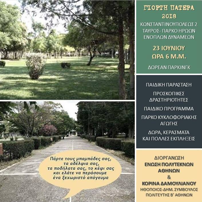 Η ηθοποιός και δημοτική σύμβουλος του δήμου Καλλιθέας, Κορίνα Δαμουλιάνου σε συνεργασία με την Ένωση Πολυτέκνων Αθηνών, διοργανώνουν το Σάββατο 23 Ιουνίου, στις 6 το απόγευμα, στο πάρκο που βρίσκεται στη λεωφόρο Κωνσταντινουπόλεως 2 στον Ταύρο, μια μεγάλη παιδική γιορτή για να τιμήσουν τους μπαμπάδες!