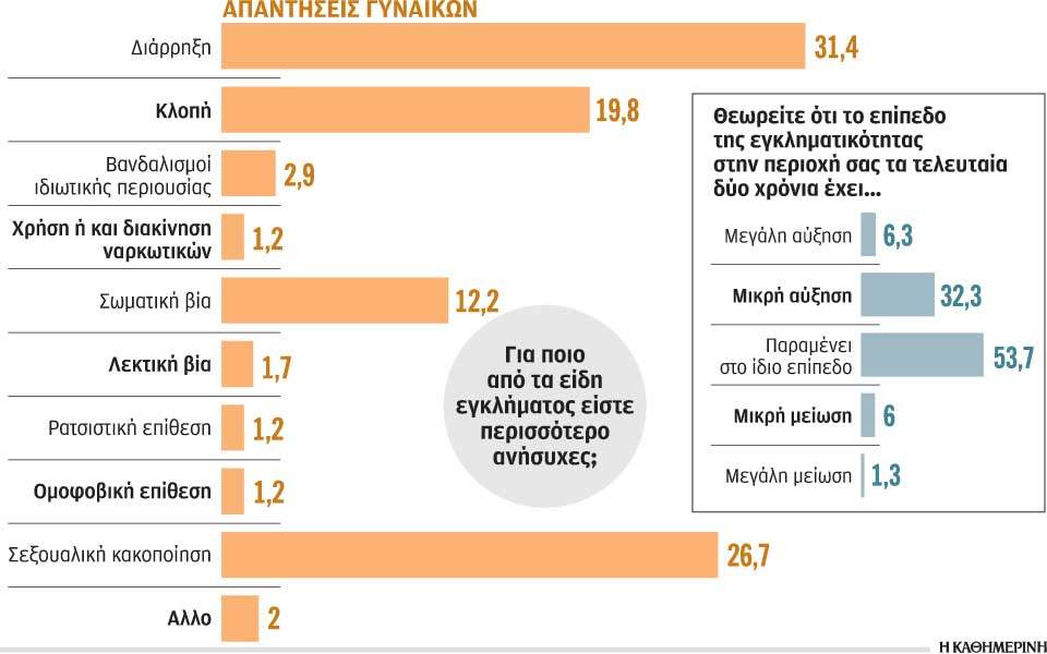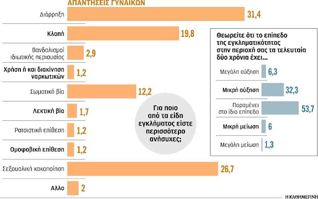Σύμφωνα με την έρευνα, το μεγαλύτερο ποσοστό ανησυχίας (41,8%) αφορά «Διάρρηξη του σπιτιού σας», ακολουθούν η «ληστεία ή επίθεση στον δρόμο» (31,3%) και με παρόμοιο ποσοστό (30,7%) η «ασφάλεια των παιδιών σε δημόσια μέρη όπως στο πάρκο ή στη διαδρομή για το σχολείο». Για τη «χρήση ή/και διακίνηση ναρκωτικών» ανησυχεί το 28% των ερωτηθέντων, το 26,7% για «κλοπή του αυτοκινήτου τους» και το 26% μήπως πέσει «θύμα εγκληματικής ενέργειας όσο περιμένουν ή χρησιμοποιούν κάποιο μέσο μαζικής μεταφοράς».