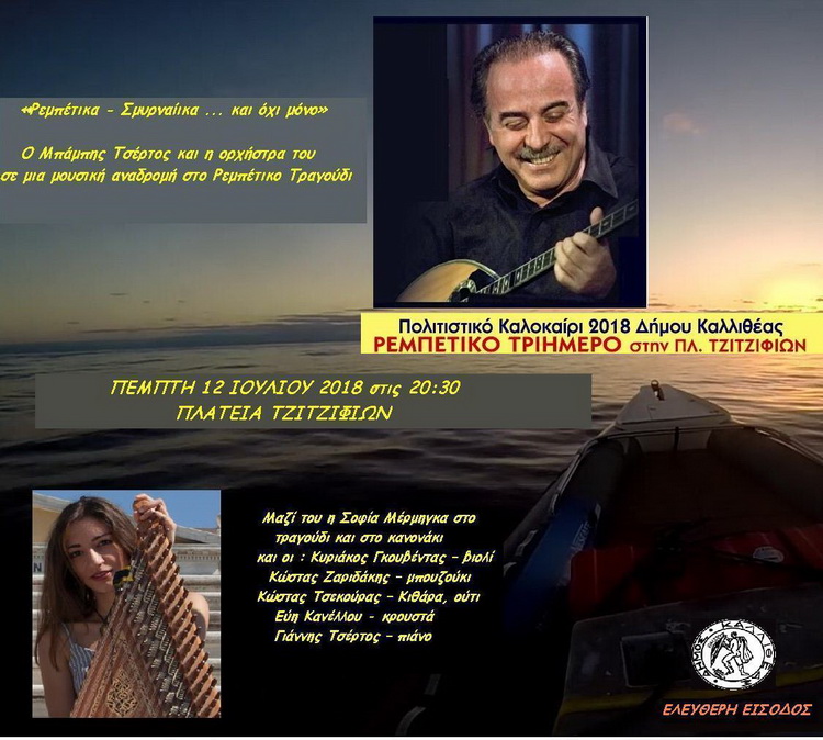 ΠΛΑΤΕΙΑ ΤΖΙΤΖΙΦΙΩΝ: «Ρεμπέτικα – Σμυρνέικα …και όχι μόνο» 11 Ιουλίου, 20182 Φεβρουαρίου, 2023 athinapoli ΠΕΜΠΤΗ 12/7 στις 20:30 ΕΙΣΟΔΟΣ ΕΛΕΥΘΕΡΗ