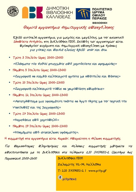 «ΘΕΡΙΝΑ ΕΡΓΑΣΤΗΡΙΑ ΔΗΜΙΟΥΡΓΙΚΗΣ ΑΠΑΣΧΟΛΗΣΗΣ» 10 Ιουλίου, 20182 Φεβρουαρίου, 2023 athinapoli ΑΠΟ 3 ΕΩΣ 19 ΙΟΥΛΙΟΥ 2018 Ελεύθερη είσοδος – Απαραίτητη δήλωση συμμετοχής στο 210 3739651-2 ΒΙΒΛΙΟΘΗΚΗ ΠΙΟΠ (Σαλαμίνος 72-74)
