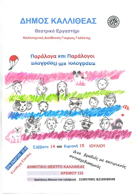 ΔΗΜΟΤΙΚΟ ΘΕΑΤΡΟ ΚΑΛΛΙΘΕΑΣ: «Παράλογα και Παράλογοι» 10 Ιουλίου, 20182 Φεβρουαρίου, 2023 athinapoli ΠΑΡΑΣΤΑΣΗ ΘΕΑΤΡΙΚΟΥ ΕΡΓΑΣΤΗΡΙΟΥ ΔΗΜΟΥ ΚΑΛΛΙΘΕΑΣ ΣΑΒΒΑΤΟ 14 & ΚΥΡΙΑΚΗ 15 ΙΟΥΛΙΟΥ 2018 στις 20:00 ΕΙΣΟΔΟΣ ΕΛΕΥΘΕΡΗ – ΚΡΑΤΗΣΕΙΣ : 210 9570001 ΔΗΜΟΤΙΚΟ ΘΕΑΤΡΟ ΚΑΛΛΙΘΕΑΣ (Κρέμου 123 & Φιλαρέτου)