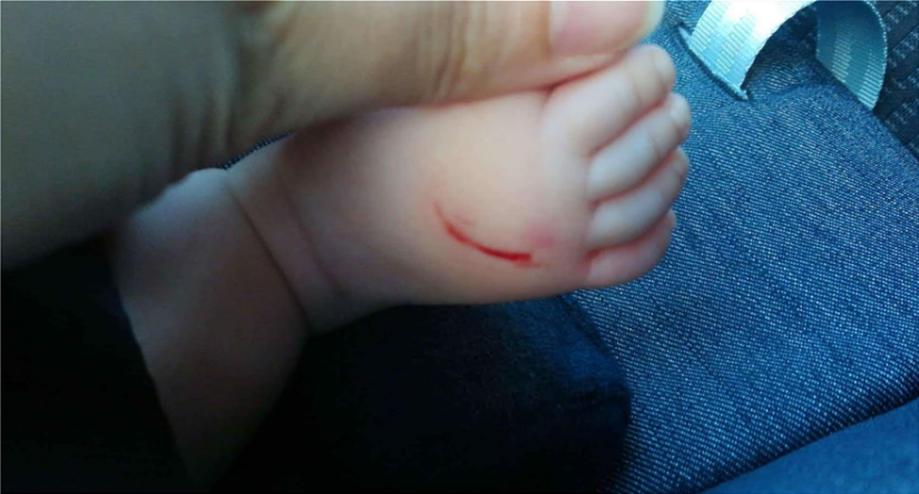 Λίγα δευτερόλεπτα μετά, με ταχυδακτυλουργικές κινήσεις και χωρίς να την αντιληφθεί κανείς, χαρακώνει τα γυμνά πατουσάκια του μωρού με κάποιο αιχμηρό αντικείμενο, το μωρό αρχίζει να κλαίει ασταμάτητα, η μητέρα του προσπαθεί να το ηρεμήσει ούσα ανίκανη να καταλάβει τι έχει συμβεί.